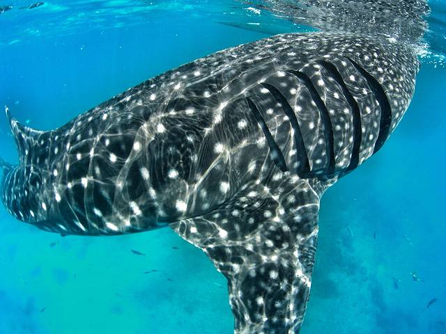 光斑洒在鲸鲨的皮肤表面,美轮美奂。