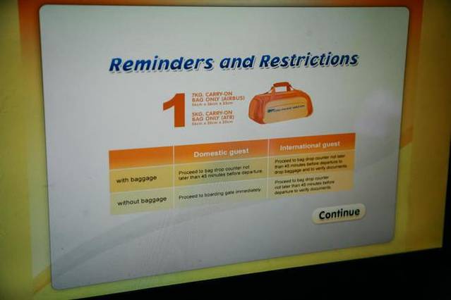 菲律宾境内换乘航班,如果没有行李托运是可以在机器上自行办理登机牌,每人限带1件行李(不得超过7kg)。