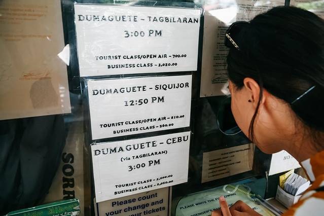 窗口排队买票,到杜马盖地Sibulan票价是62P/人,半小时这样就可以抵达了。