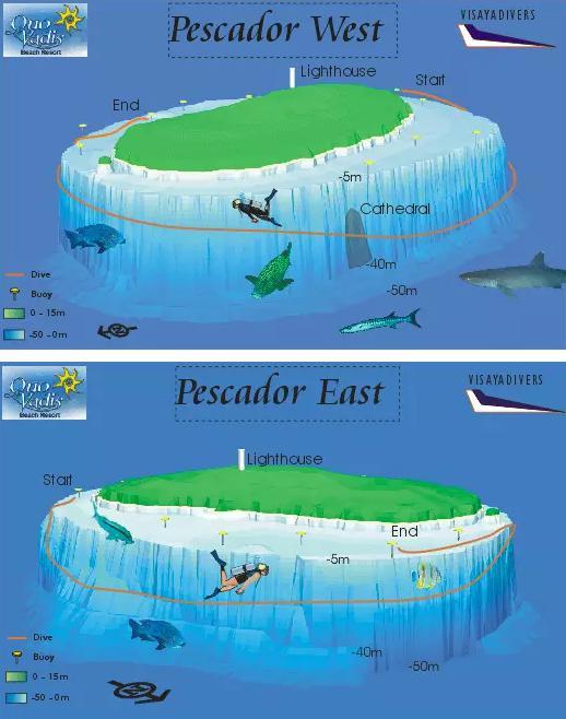 岛屿分为东西两侧,潜水会环绕Pescador一整圈,看完珊瑚墙后,会继续潜到岛下几个洞穴的位置钻进去。下午在近海浮潜就可看到沙丁鱼风暴,据说15:00左右沙丁 鱼最为密集;