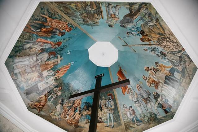 当地人认为只要将十字架削成屑服用,就能够医治百病,便把它的外皮剥落拿走,于是当地人便用特制的木头打造了一个空心外框把它包藏在内。同时,六角形的天花板壁画,保留着当年的原貌,色彩非常艳丽逼真。