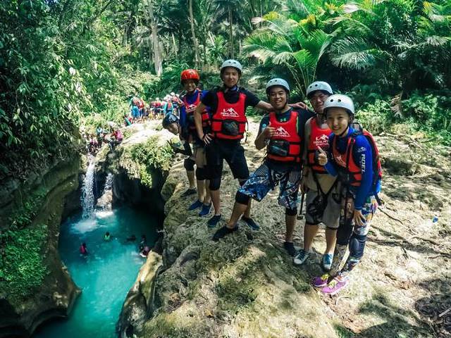 在Maya Hotel,我们结识了4个台湾盆友(3高雄、1台北),加了facebook之后,我们约了一起去Kawasan Canyoneering瀑布溯溪。(这张是我们在溯溪起点的合照↓)