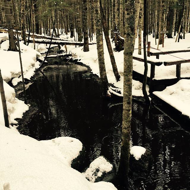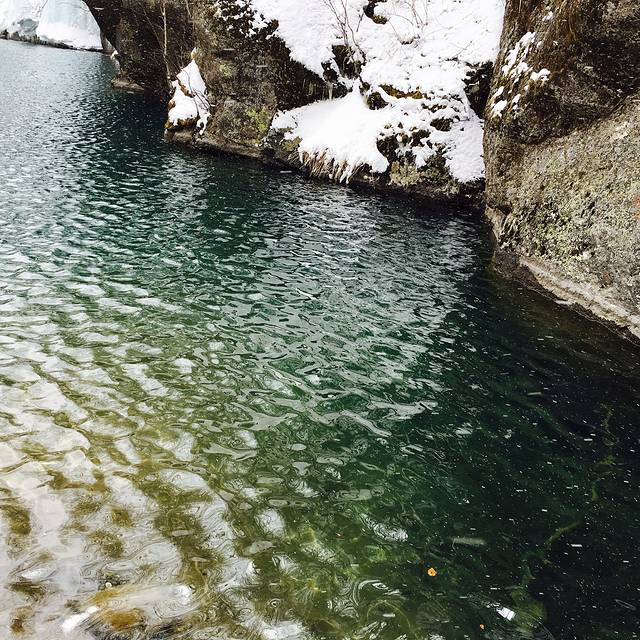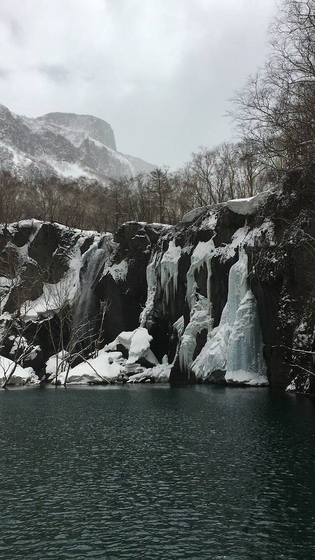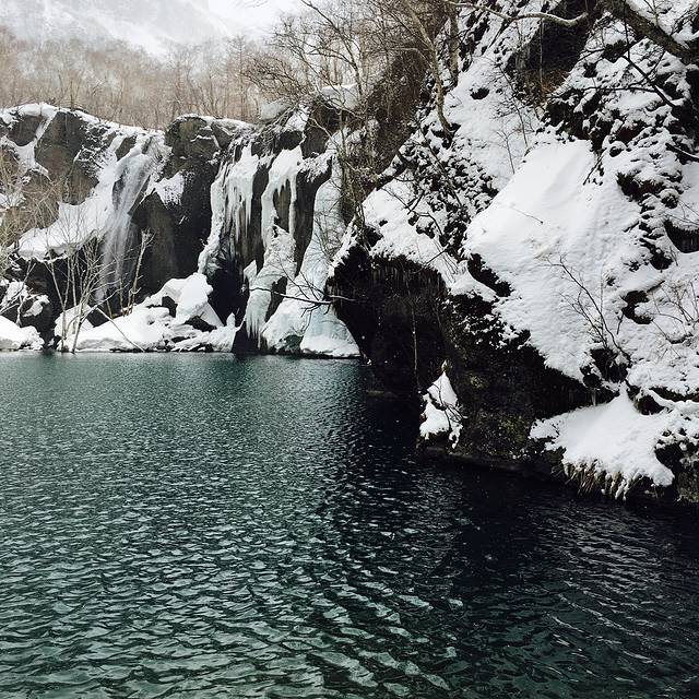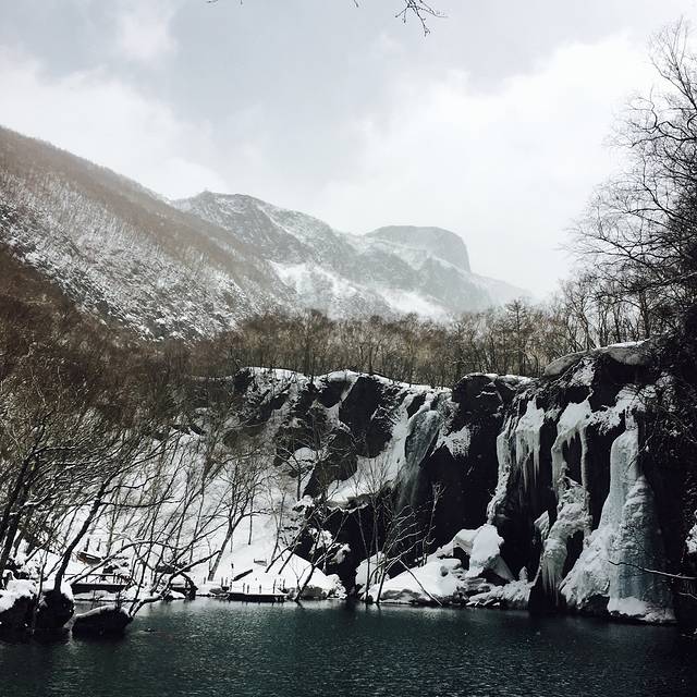 很远就听到流水声,走进看.池水碧绿,因水中矿物质多反光而成,潭水之上有个瀑布,比长白瀑布规模小很多。没有结冰,终于让我看到一个瀑布。
