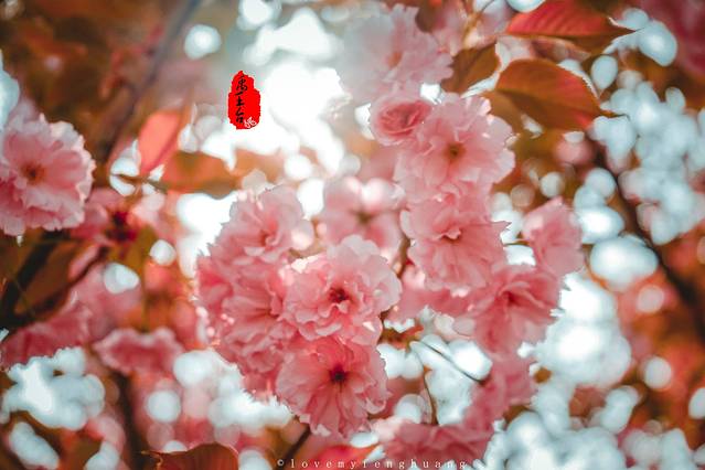 种满了如酷似桃花式的粉色樱花,没有对树种的牌子说明,应该是一种“红叶樱花”,多重瓣,花朵较大,唯美中都带着些许中原的大气,不同于江南的美。红叶樱花有长梗,叶子有微微的淡红色,听说,5月到7月会变为暗红色,之后还会渐变成淡紫色,徜徉在花花世界中,春光无限好。