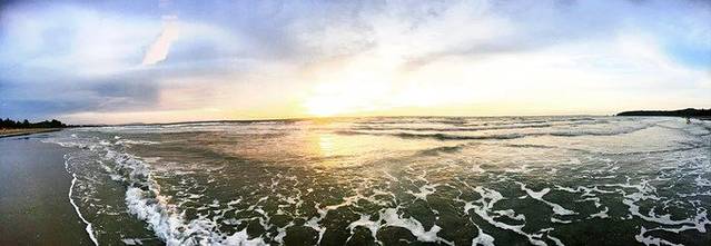 不同的时刻,海天呈现不一样的颜色,细而柔软的沙滩让人流连忘返,一抬眼就是整片整片的红日蓝天,加上火烧云搭配的碧蓝海水,大自然的写生画何其壮阔而又不失柔和;