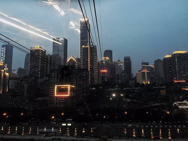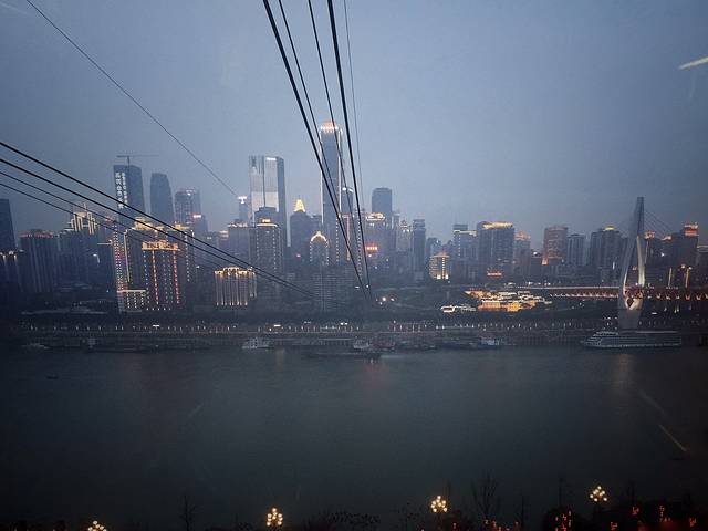 然后我们就向长江索道粗发,南岸索道口离老街很近很近,走几步就到了,最主要是人很少,为了看索道夜景活生生等了2个来小时,等的花都谢了,但是很值得,毕竟最近都是雾霾,夜景才有看头,不过真的时间好短啊,也就几分钟就到对面了(解放碑那边索道口),过去之后发现那边上索道的人都排到马路上了