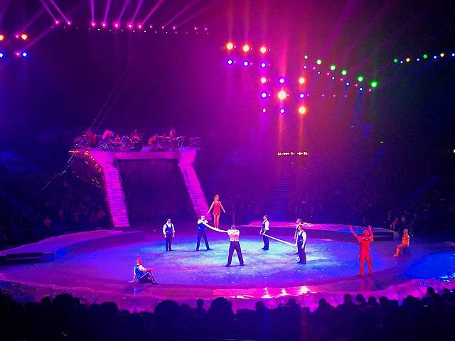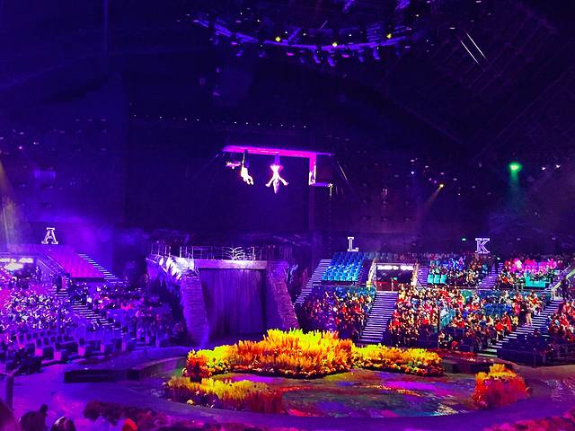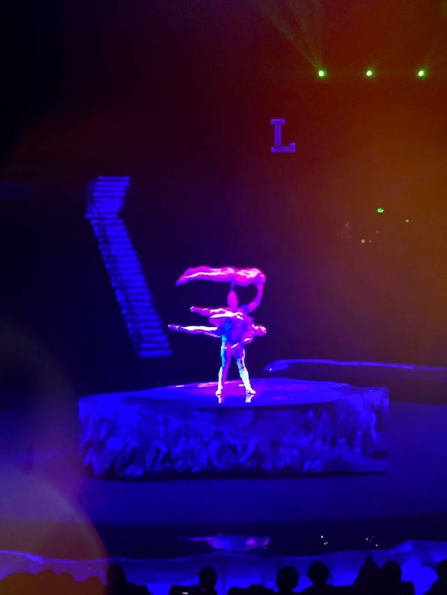 马戏的开始首先是热身的时间段两名舞者走高空中,倒挂着打兵乓球,女舞者不停的变换华丽衣服后……