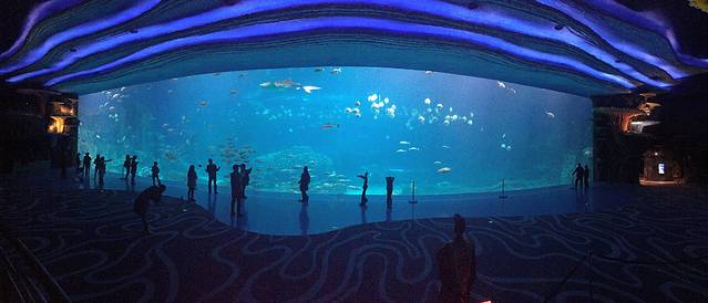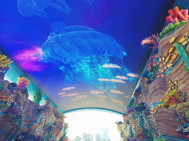 走在弧形的水底长廊,成千上万的鱼类在您身边游过,圆形穹顶透现出五光十色的海底世界。