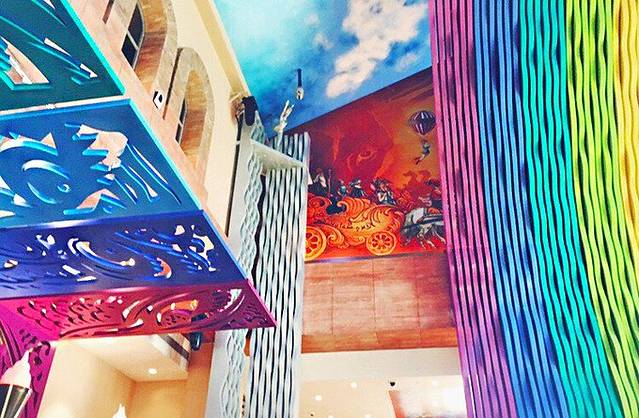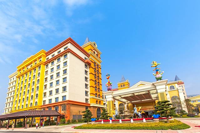 直达大巴刚好第一站停靠的地方就是我们的马戏酒店,酒店外观以欧洲小镇为蓝本,高低错落的屋顶、复古外墙、颜色跳跃的建筑体以及造型独特的钟塔等,让游客感受欧洲马戏小镇的奇幻风情。大堂以“神奇彩眼”为主题,在灯光与色彩的配合下,如入梦境。