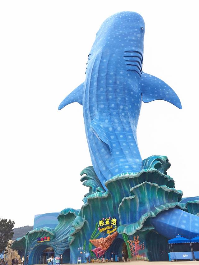 海洋馆的流线外型十分独特,犹如一颗闪烁异彩的海洋明珠,珠海长隆海洋王国的地标——巨型蓝色鲸鲨雕像高达63米、约18层楼高,非常震撼。这里是世界最大的海洋鱼类展览馆,馆内饲养有不同品种的珍奇鱼类多达15000条,水体3.1万立方,比目前世界上最大、水体为1.5万立方的水族馆水体还超出一倍之多。