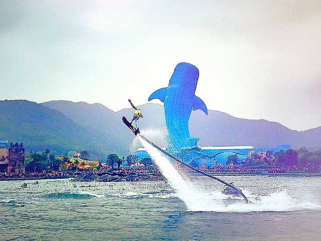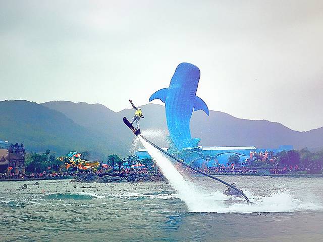 准时17:00分在横琴海出现水上摩托艇的那一刻,一轮精彩的水上秀即将呈献!水中勇士矫健的身姿,展示了一幕幕时而平湖跃起、时而空中翻转的绝妙奇技。