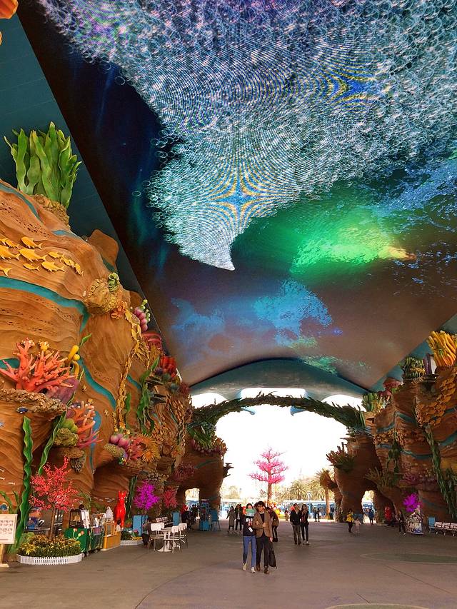 首先进入眼帘的是一个巨大的深海世界LED长廊,我可是被它所震惊,蝠鲼造型的天顶,加上巨幕LED上的海洋生物不断从天顶掠过,栩栩如生的3D效果让人目不转睛……