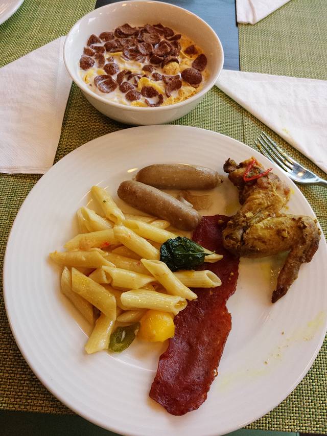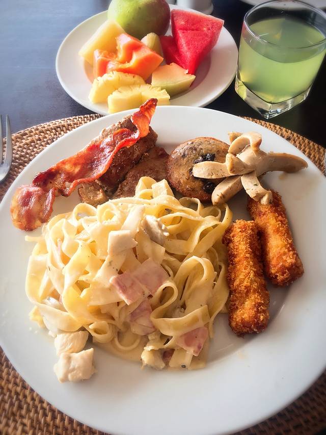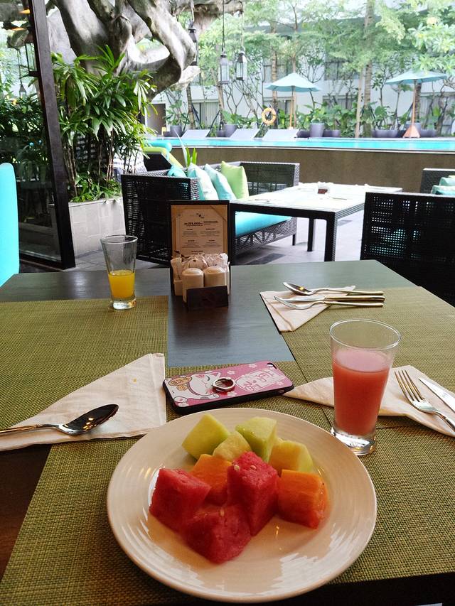 自然醒后,在美居酒店吃了最后一顿早餐…准备换酒店,再到芊寻驻巴厘岛工作室开婚前会议、选婚纱等。美居酒店的早餐很丰富,早餐厅直对泳池…一边吃饭,一边看着外面的郁郁葱葱…心情大好…