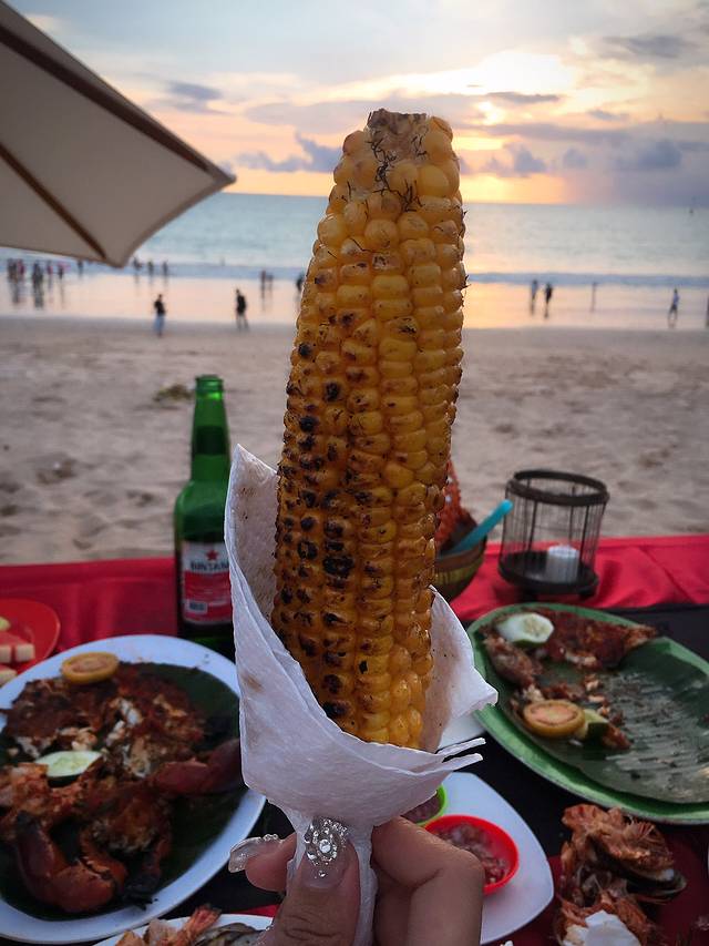 海边有一处卖烤玉米的摊位车(5元/根),一定要尝尝!不知道在玉米上涂了一层什么酱料,味道非常好吃…
