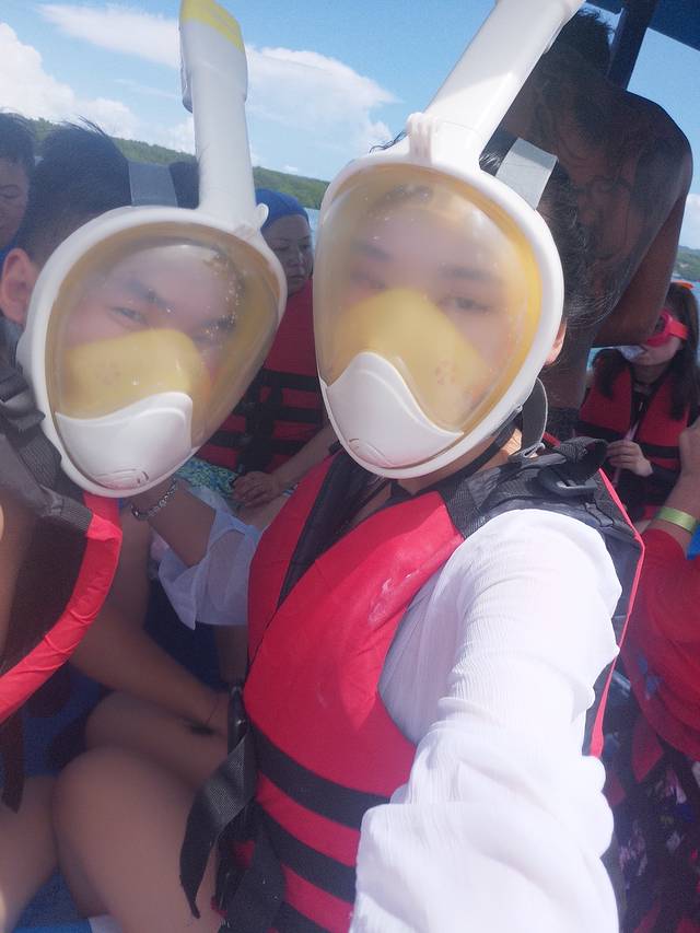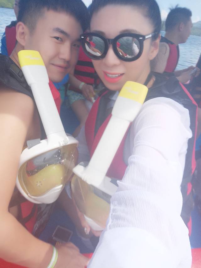 早上7点30司机准时来酒店接我们,从巴厘岛大概坐船30分钟到蓝梦岛,随后便出海玩儿各种水上项目…建议准备浮潜的亲们,自行买好浮潜装备,虽然卖家都为大家有所准备,但样子实在太丑了…戴上后完全看不出谁是谁了…我们一起去的有一对小情侣,便是自己带得装备,瞬间高大上了很多呢…奉上两张我跟老公准备浮潜时的丑照……