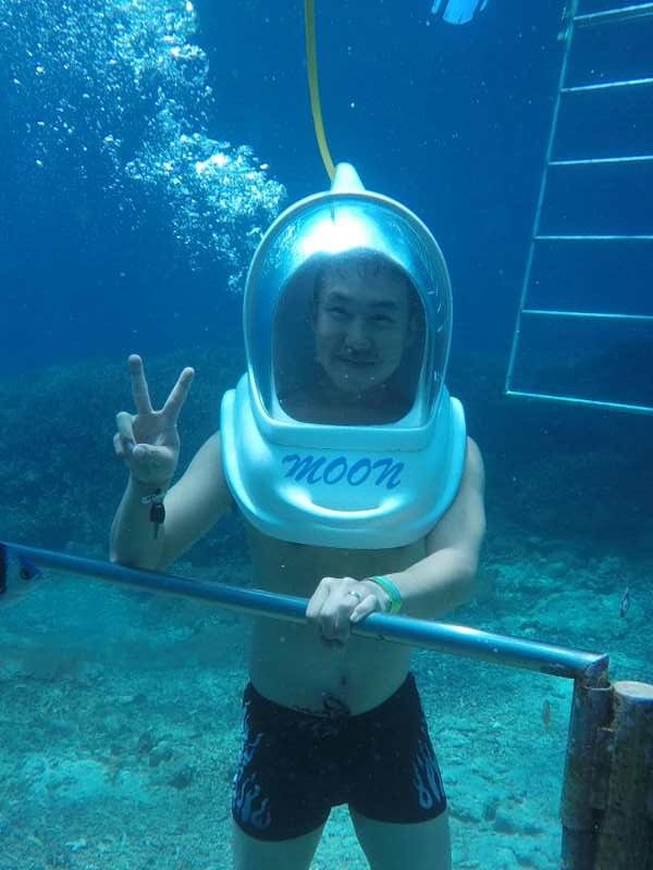 个人认为海底漫步是几个项目中最好玩儿的…在下海之前教练会告诉我们各种注意事项,需要注意聆听…最关键的就是海底漫步往深海走的时候耳朵会很疼,比飞机起飞时还要疼得多得多…所以在岸上的时候,就需要捏住鼻子,用力吹气,耳朵就会有“啧”的声响,反复做此动作…以减缓下海后耳膜的压力…或者不停的吞口水也可以减缓耳朵的疼痛…
