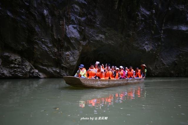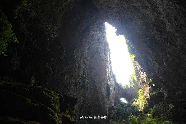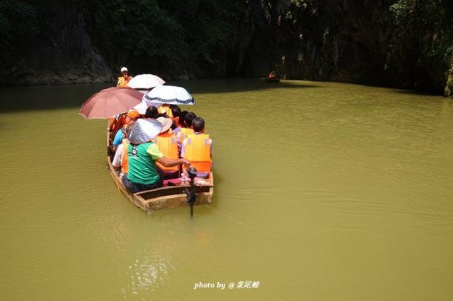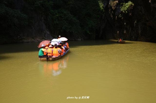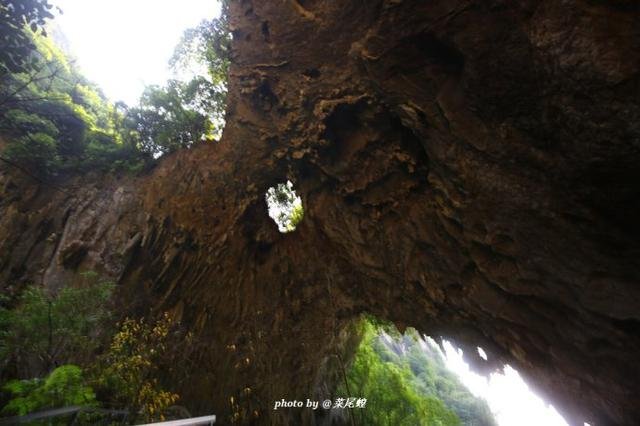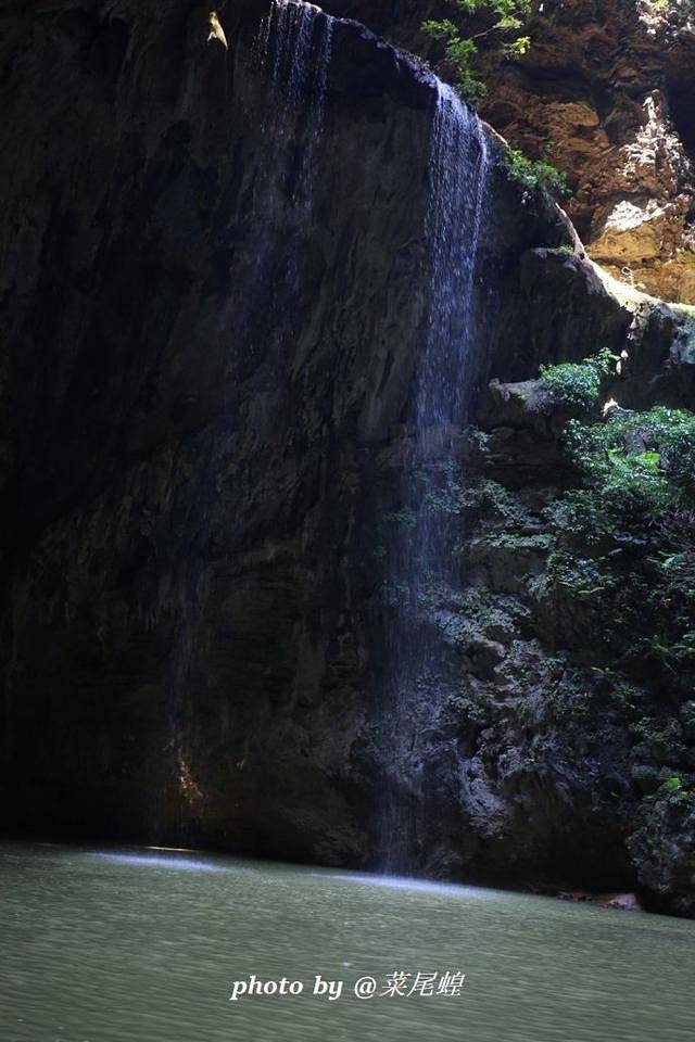洞口有如一条龙舌,船缓缓进入洞中,去探寻未知的世界,光从洞顶泻了下来,一条瀑布如白练有洞如盗墓笔记中的场景一样,小河弯弯穿过洞中,豁然开朗,如武侠小说里经常出来的岩洞一般。