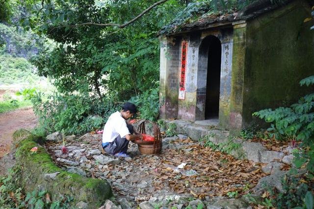 过了桥,村口有一座土地庙,时逢端午节,当地村民虔诚地带着贡品来拜神,祈求平平安安。