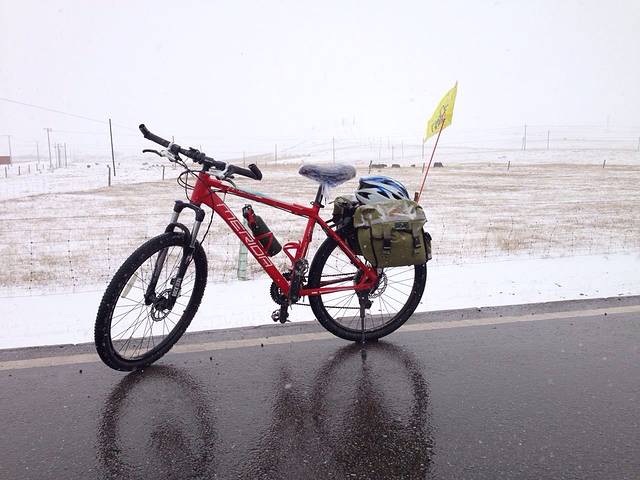 挑选自行车驮包绑旗子拿装备
