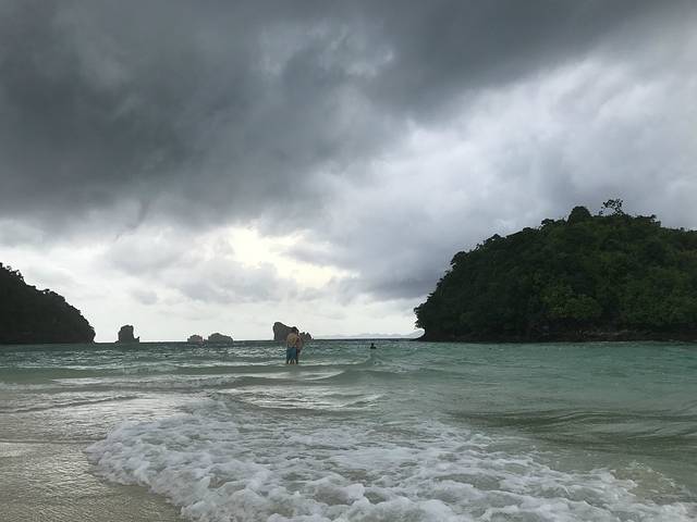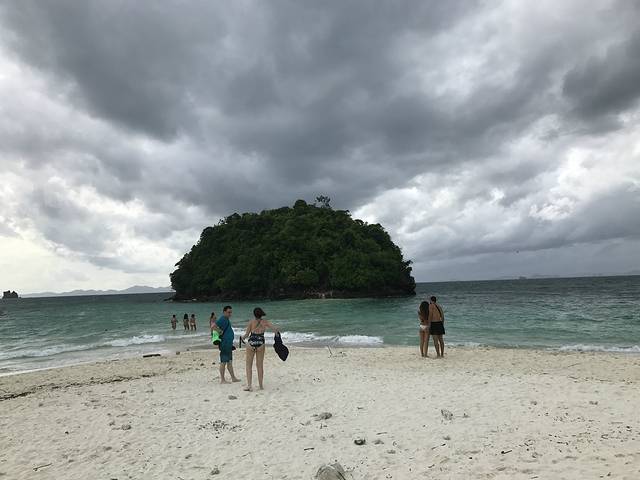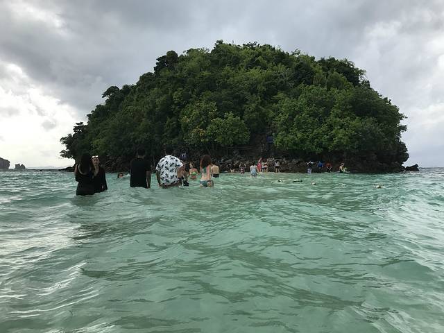 第二天一早吃过早饭,我们就在酒店大堂等车准备跳岛游的车来接我们。第一天我们报的是“甲米七岛一日游”(全英文),价格195元人民币/人。由于我们去的时候是雨季,第一天出行是阴天,所以并没有安排我们看日落……(遗憾ing~)这天的安排主要是浮潜,波达岛、鸡岛(只可远观,不能上岛)还有一线天等。