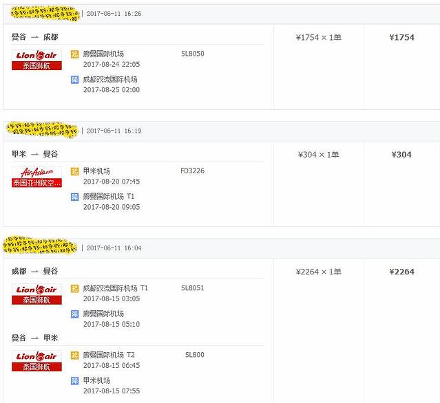 机票是提前2个月在去哪儿订的,联程票,一共飞3次,是凌晨的飞机,具体价格见下图一,来回都是泰国狮航,第一次体验不咋样!