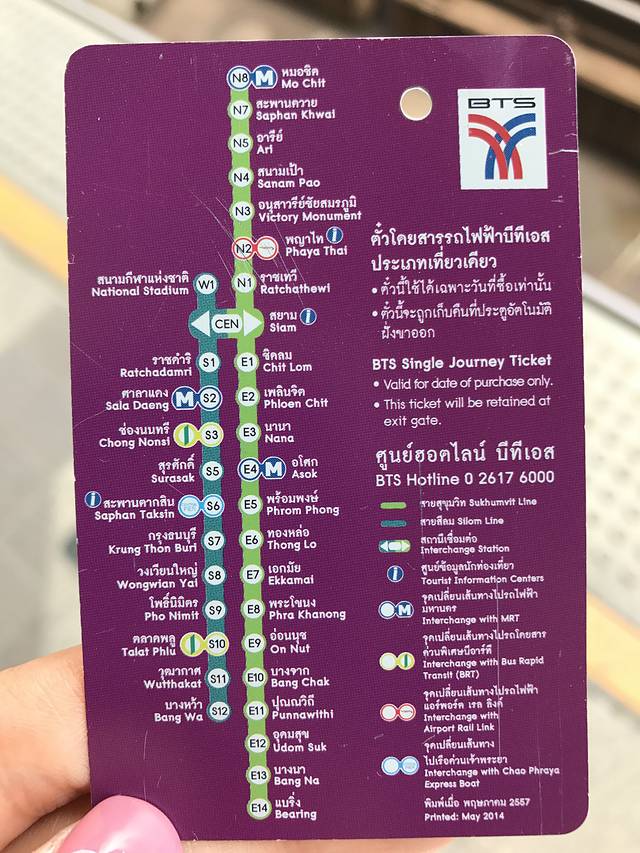 这个是BTS临时车票~曼谷的BTS主要分了两条线,有些站中间有一个“M”的表示那里有MRT,即地铁。我去了两次曼谷都没有坐过地铁,一般游玩地点BTS都可以到达。