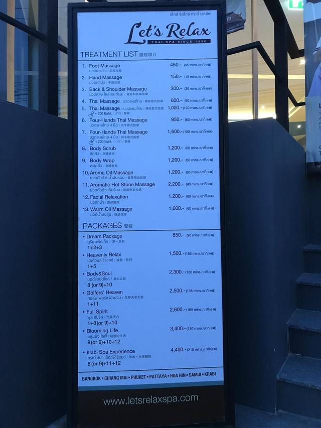 晚上去了酒店附近的【Let’s relax】按摩,这个是需要提前一天预约的,因为网上很火~很多人在TB上定,但是价格的话我觉得你去现场订还要便宜一点,而且TB上很多时段都无法预订,现场的话可选择时间很多。这家按摩店就在主街上,很好找,离我们酒店不行大概几分钟~环境很好,服务也不错。