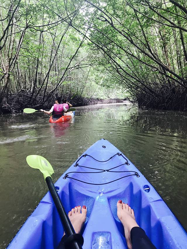 从海面划到树林里,也要小心不要撞到树枝,我们就差一点撞到……