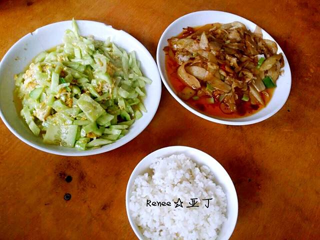 晚餐,黄瓜炒鸡蛋和茄子片,两碗米饭80元