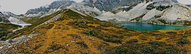 来张全景,站在山坡上能看见牛奶海和五色海。