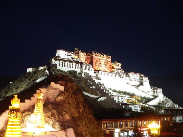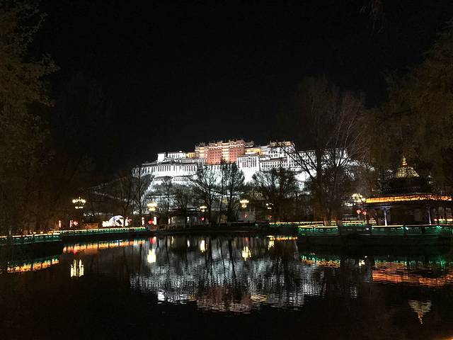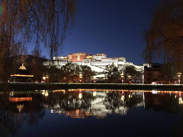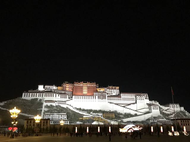 布达拉宫的夜景照明与白天不同,白天的白墙红墙金瓦显得布达拉宫就像个威严的君王,坐阵一方。而夜晚的布达拉宫,更多了一些妩媚和温情。