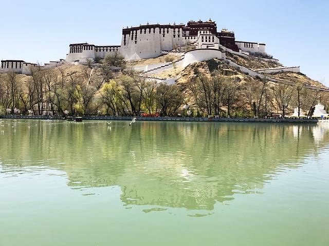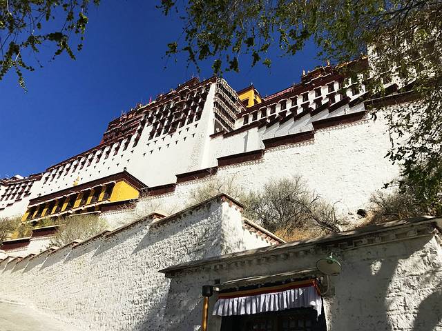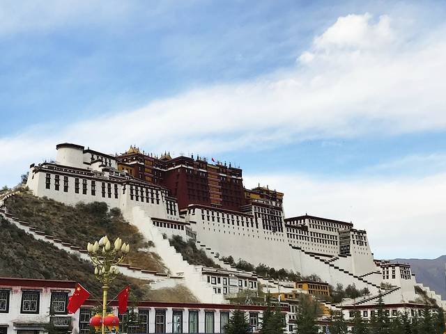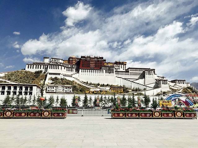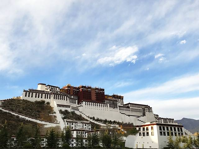 一座屹立在海拔3700米的玛布日山上的宏伟建筑——布达拉宫。主体建筑分红宫和白宫,主楼高13层,高115.7米。重重叠叠,迂回曲折,同山体融合在一起,高高耸立,壮观巍峨。宫墙红白相间,宫顶金碧辉煌,具有强烈的艺术感染力。宫内的一砖一瓦都可以说是集藏族传统文化、宗教文化之大成,被誉为“世界屋脊的明珠”。布达拉宫收藏和保存了大量极为丰富的历史文物、奇珍异宝,随便一处,便是价值连城。它是拉萨的标志,更是雪域高原的象征,是西藏建筑艺术的珍贵财富,也是独一无二的人类文化遗产。