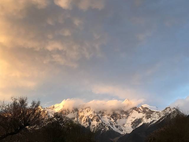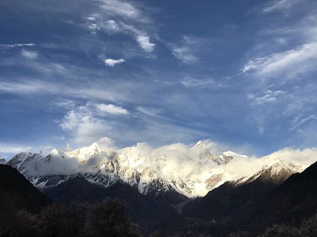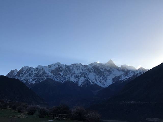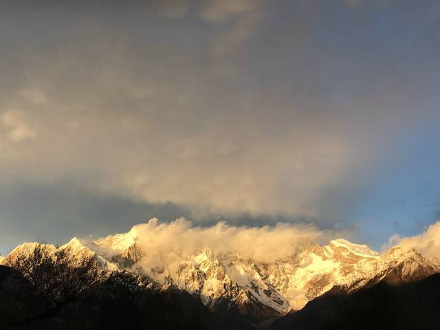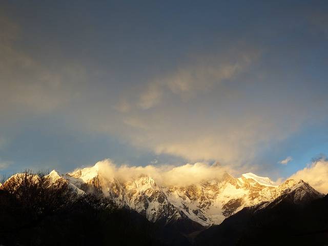 当一抹夕阳渐渐染红了天际,远处的地平线上,霞光挥动着绚丽的纱巾。模糊间,天空中的云霞变化多端,南迦巴瓦峰像个羞涩的少女,用云朵遮住了自己的面容,时而露肩,时而露耳。不一会儿,一阵微风乍起,看山体到山尖被一点点地点亮,南迦巴瓦峰被镀上了金黄色,这就是传说中的日照金山之美景,极具震撼力。