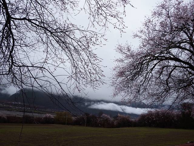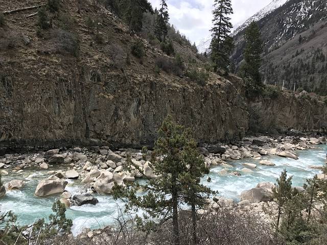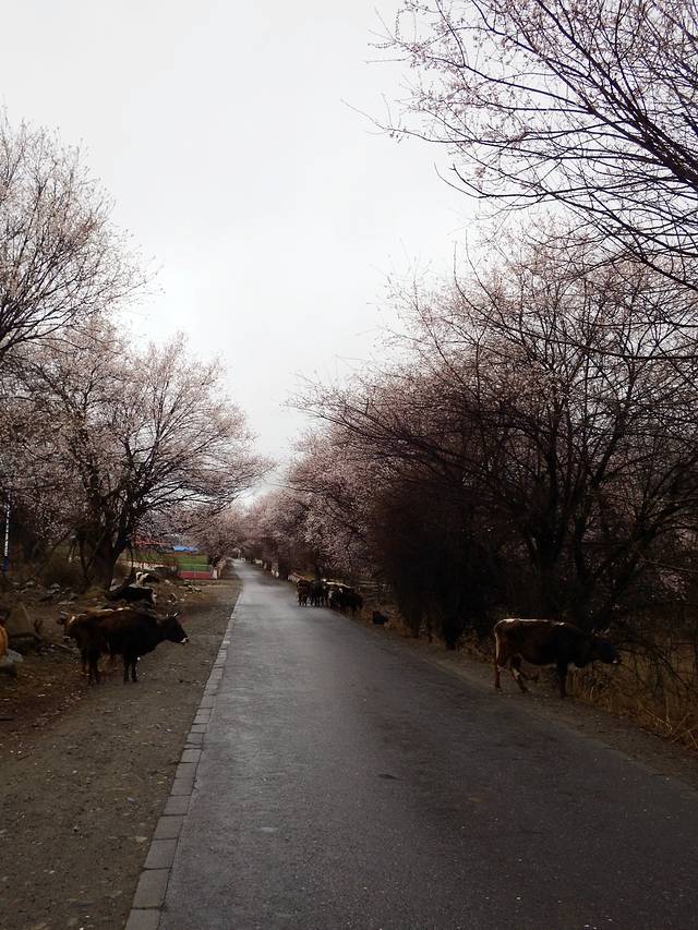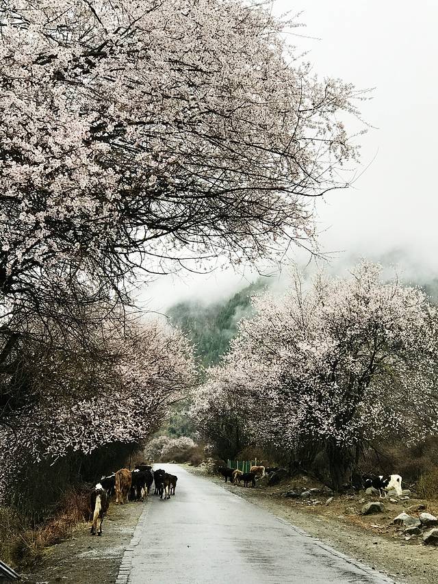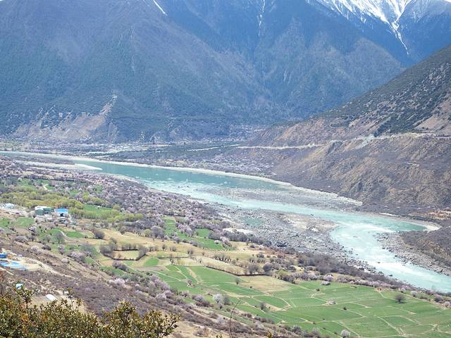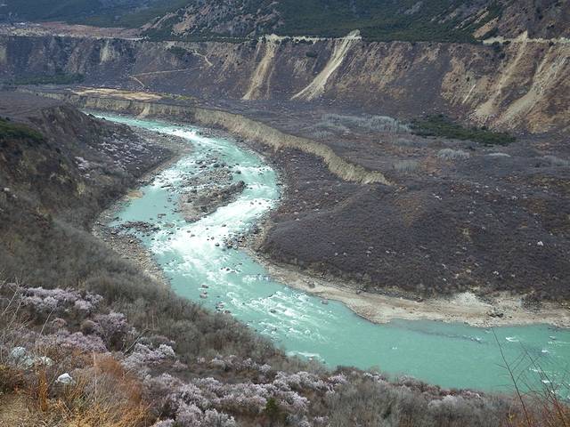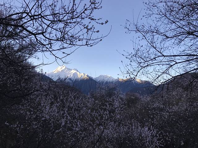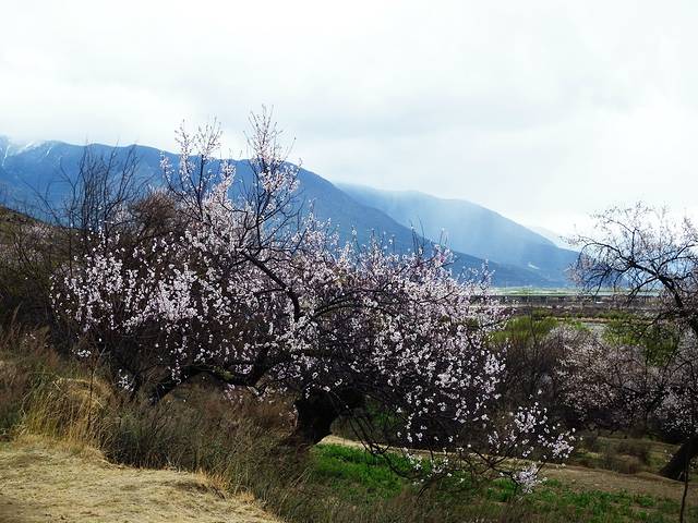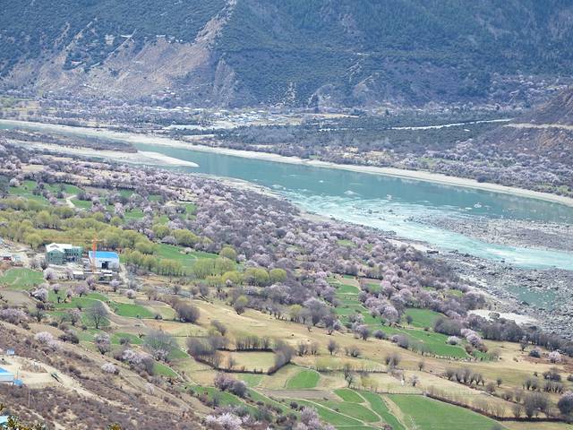 远处的雪峰还是皑皑白雪,而眼前的桃花已如醉霞绯云般争奇斗艳。一朵两朵,一树又一树,铺满整个山坡,伸向河谷蔚然成花海。那蜿蜒划过的曲线,粼粼波光勾勒的枝丫,漫滩衬映出的翠绿清漪,飞落在翠绿间的沙粒伞花,都是颇富浪漫诗意的图画。