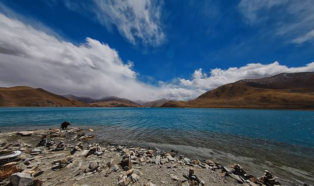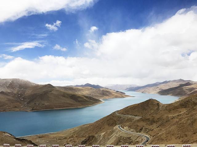 不同时刻阳光的照射,她会显现出层次极其丰富的蓝色,好似梦幻一般。当地藏族人民用民歌赞美羊卓雍错:“天上的仙境,人间的羊卓”。她的艳丽让人几乎不敢相信,就连最优秀的摄影师也不能拍下它所予人的震撼。