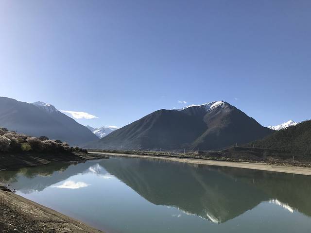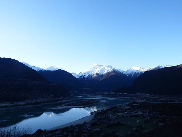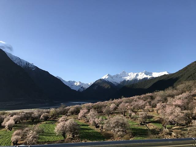 粉嫩的桃花,在气势磅礴的雪山怀抱中无限柔媚,映衬着湛蓝的天空与碧玉般的尼洋河,尼洋河畔、雅江江畔、雪山之下、河谷之中,竞相怒放。