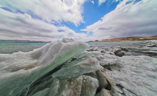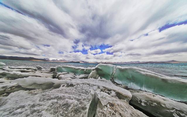 纳木错,藏语为“天湖”的意思。4月,冰封的圣湖纳木措湖面已经开始一点点的融化,这是个和大家平时印象中碧海蓝天不太一样的纳木错。冰雪虽未完全融化,但她在念青唐古拉的怀抱里,却如梦中才能见到的少女,娇羞却也明朗。如果说羊湖以辽阔壮美而得名,那这个季节的纳木错则以纯净深得人心。