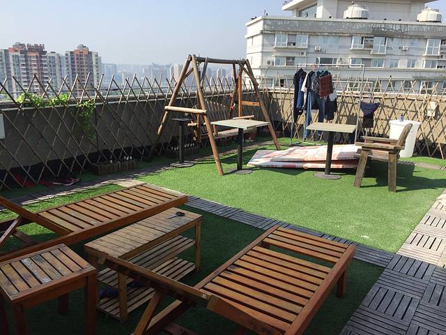 这是一间位置极佳,隐藏极深的有爱的客栈,位于一件写字楼的28层,复式二层有个天台,天台上该有的东西这里都有,秋千,花架,草坪,一只野猫,空啤酒瓶,和对自由的向往...据说泳池和高尔夫球在筹备中...