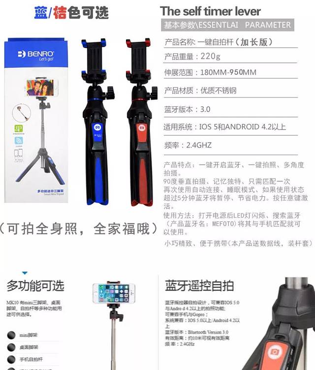 我的这个自拍杆是朋友送的,轻巧功能多,自从有了它,旅游必带。合影不求人,遥控器可以取下捏在手中控制拍照,非常方便。