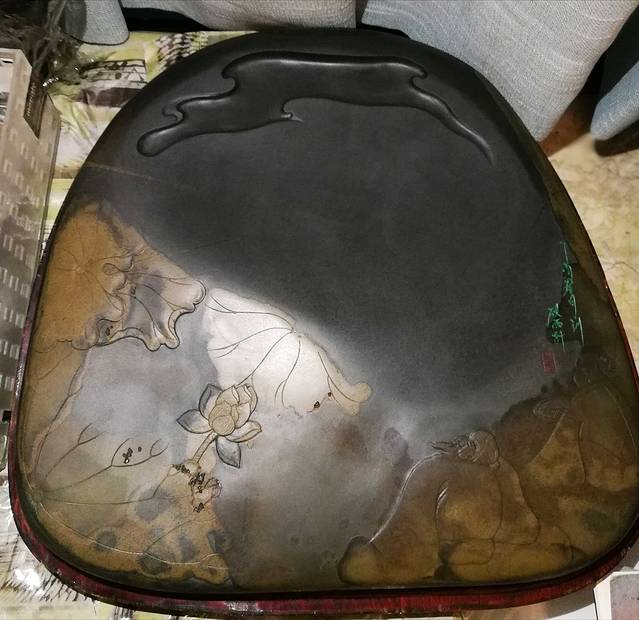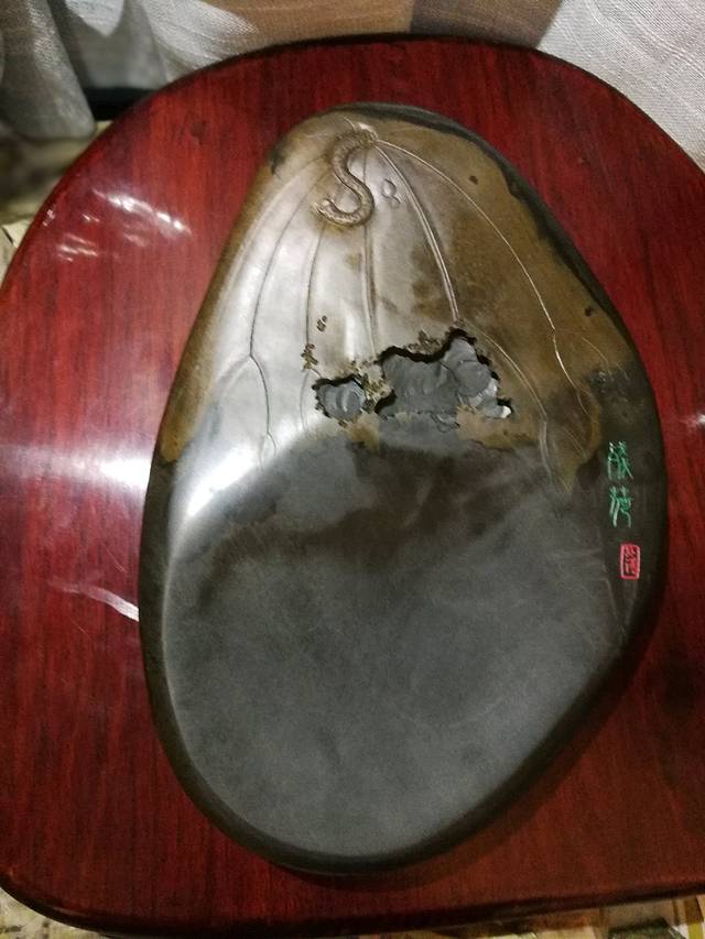 我觉得这块有味道,皮上的缺口巧妙地设计成残荷的叶子,书本大小的一块,标价900。文房四宝是喜书画之人的爱物,杀价高手的修哥遇到了心爱之物,也不舍得狠杀,2000元把两件收入囊中。