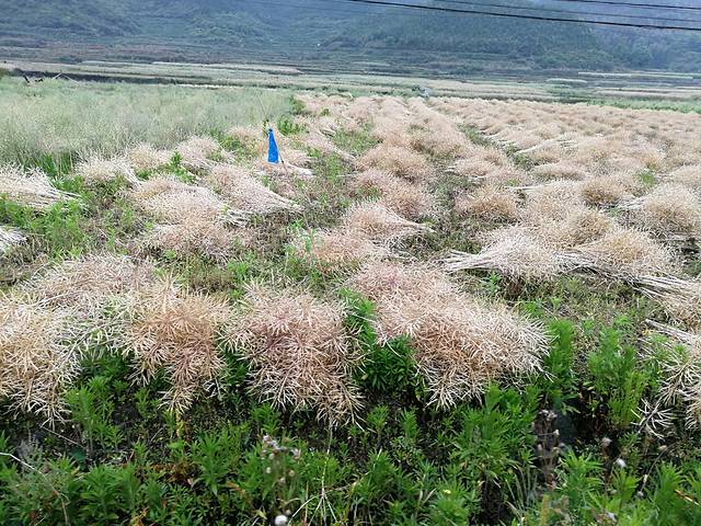 下山的时候,雨落下来了。收割的油菜一簇一簇的排列在地里,如油画一般。