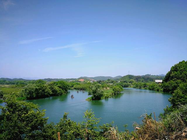 站在岸边,放眼望去,天蓝蓝,绿荫浓密,一泓碧水,三两扁舟,很是养眼。修哥说,要不要下去划划小船?太阳很大,出来没带帽子,虽然很想,怕晒出老年斑,只好作罢。