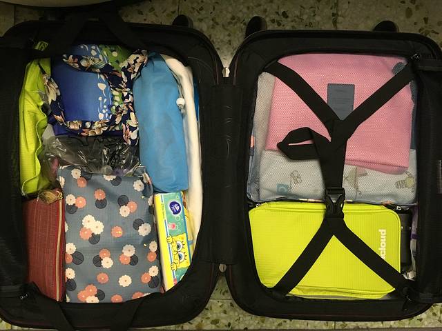 刚好塞满的20寸行李箱,事实证明,这箱子虽然可以拿上飞机,但回来的时候真的不够装。幸好我还有装零食的环保袋。