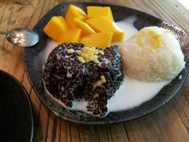 芒果糯米饭,椰汁的糯米饭,黑糯米比白糯米好吃!单个饭的芒果糯米饭26元,加一个椰汁糯米饭团8元