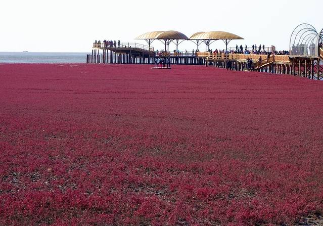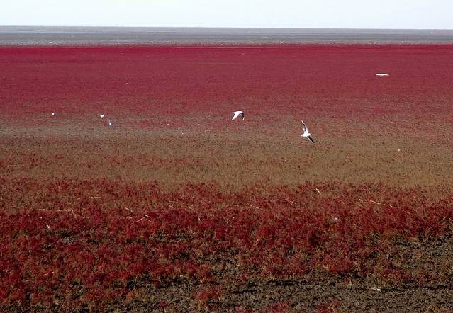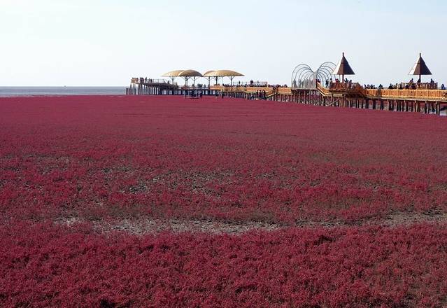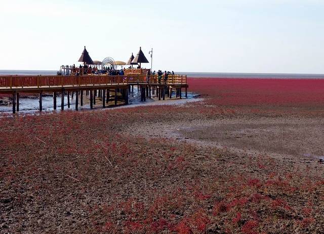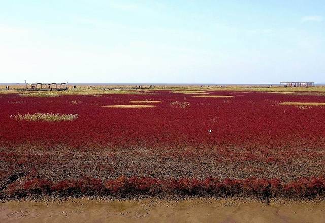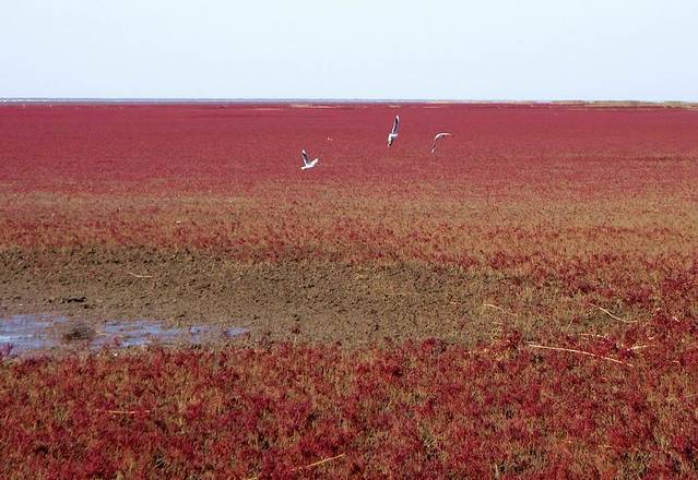 在“ 红滩出海”,可以看到水中的红海滩,尤其涨潮后,碱蓬草浸浮在海水中的情景相当特别。