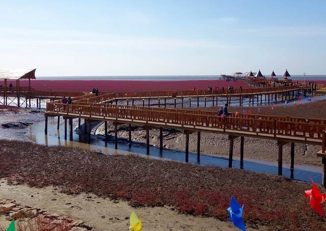“爱情宣言廊”是碱蓬草面积最广的一片,踏上木栈道至红海滩深处,可以亲近这大片的红海滩。