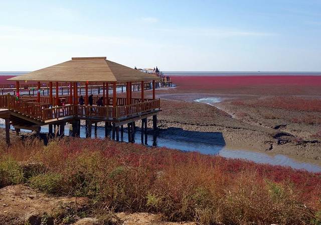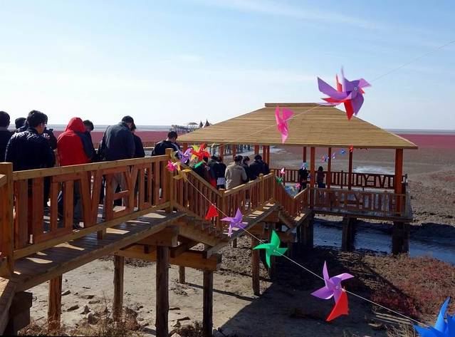红海滩国家风景廊道景区于2013年9月13日开园。红海滩国家风景廊道被当地人称为“外滩”,而过去所说的红海滩风景区是老景区(即大洼的赵圈河),当地人称为“内滩”,两个景区相隔约10公里左右。照片摄于红海滩国家风景廊道景区。