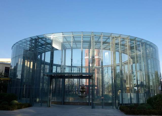 这是综合楼的大堂,有凉亭和绿色植物。
