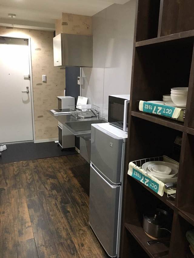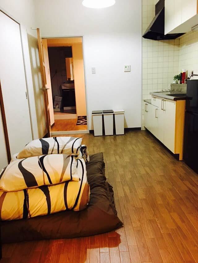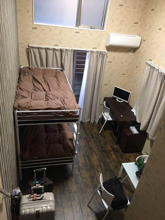 两站就下车,稻荷站,出车站对面就是伏见稻荷大社。雨天,右手拖着箱子,左手拿着手机导航,导致我的手机进水,触摸屏的下面一部分不灵敏,当天晚上拍照和打字都不方便,好在第二天就好了。花了些许功夫,找到了订的民宿,破密,拿到钥匙,推门进去,相当满意。每次入住新地方,推门进去的一刹那,都是相当令人期待的。迷你loft,楼下上下铺,楼上床垫,我当然是睡楼上啦。