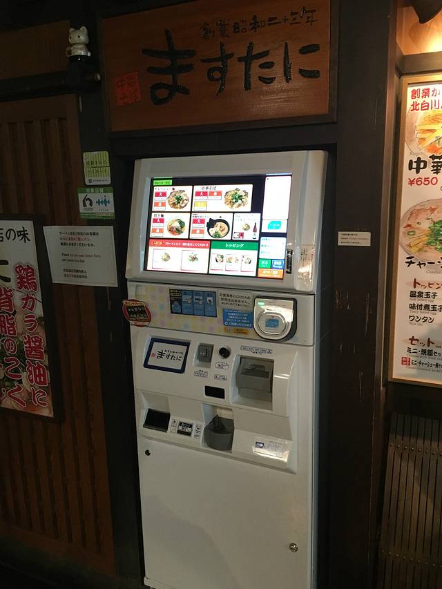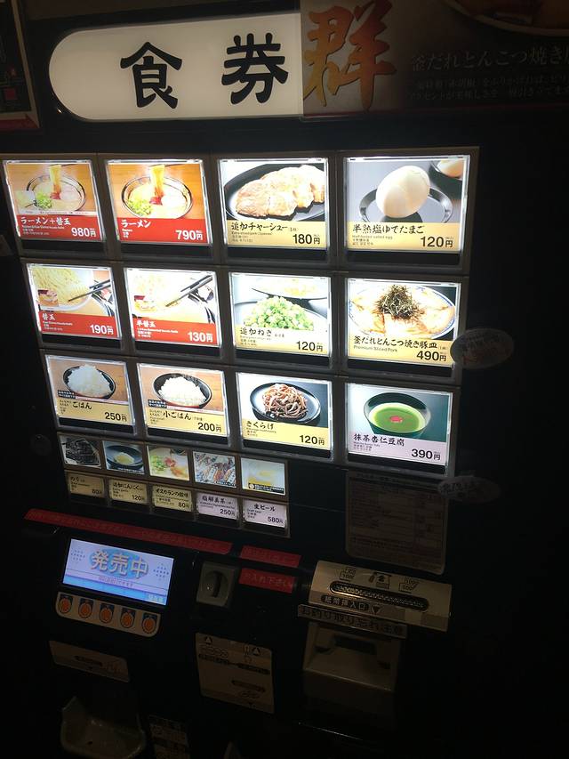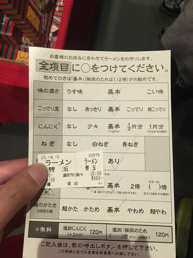 晚上去一兰拔了草,酒店走过去二十分钟。所以我没必要在大阪或者京都排大长队,名古屋这边我排了十几分钟就进去了。这家分店是在外面排队快要排到我时,服务员就会递上单子和笔。我没有要中文单子,因为半年前我就知道了每一行的勾选各代表着什么,辣度、软硬度、葱白青葱等等。所以尽管日文,我选起来毫无障碍。进去后在自助点餐机上塞钱,选择,出来票子和找零。我买的是拉面+替玉,就是吃完可以加面。